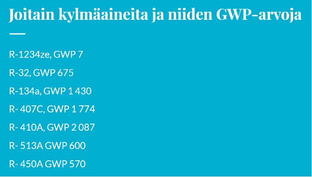 - Yli 2500 GWP-arvon kylmäaineen täyttämiskielto olemassa oleviin lämpöpumppuihin, pl. kierrätetyllä kylmäaineella saa huoltaa vuoteen 2030 asti